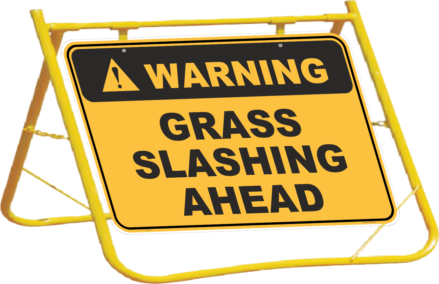 Grass Slashing Ahead sign with stand is aluminium and the frame is yellow steel. Contact us for pricing on bulk orders.